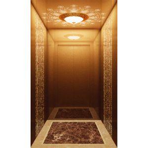 The FUJI-Home Elevator – Model M brings natural beauty and refined elegance to your living space. Its ceiling is framed with wood decoration, featuring light-emitting marble that radiates a soft, inviting glow, enhanced by down lamp lighting. The car walls combine sophisticated wood detailing with an etched titanium gold mirror, creating a warm yet luxurious ambiance. The PVC flooring adds practicality and ease of maintenance, perfectly complementing the overall design.